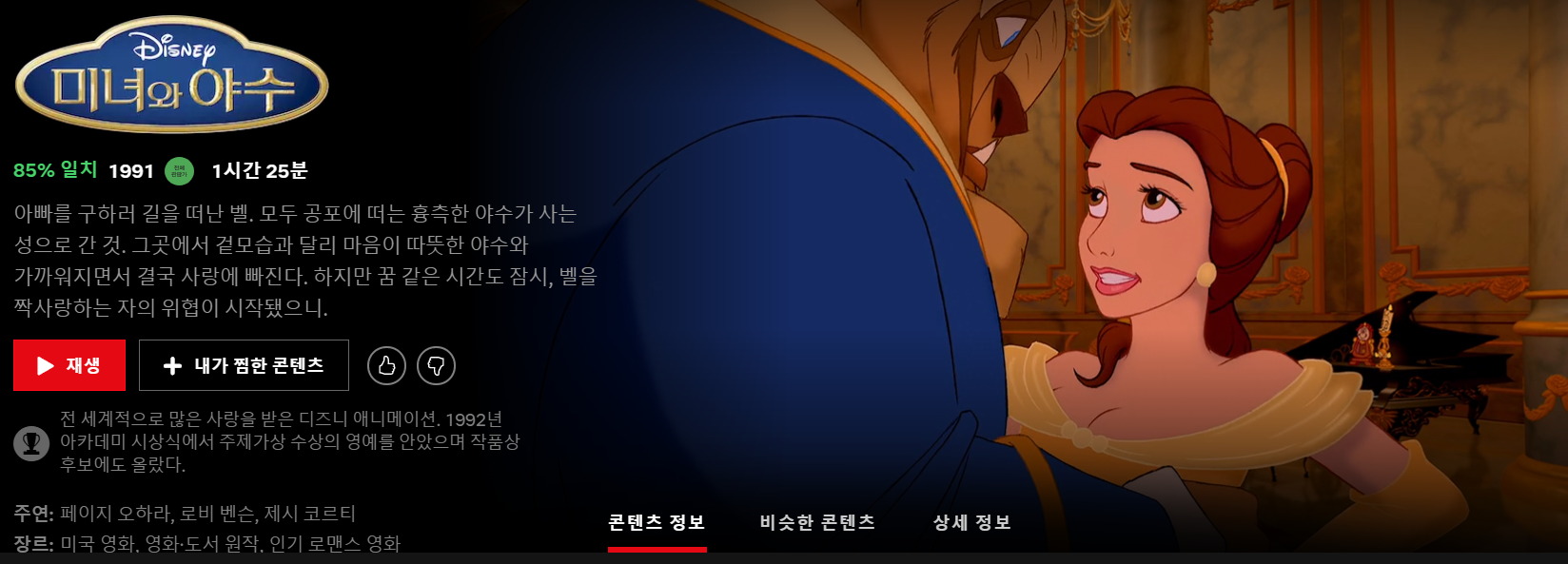 몇년 전, 엠마왓슨이 주연으로 나온 실사화 영화로 한번 더 주목을 받은 미녀와 야수 이야기 입니다. 애니메이션도 뮤지컬 형식인데요. 실사화 영화를 본 친구들이라면 한번더 고전 애니메이션으로 봐도 느낌이 새로울 것 같습니다.