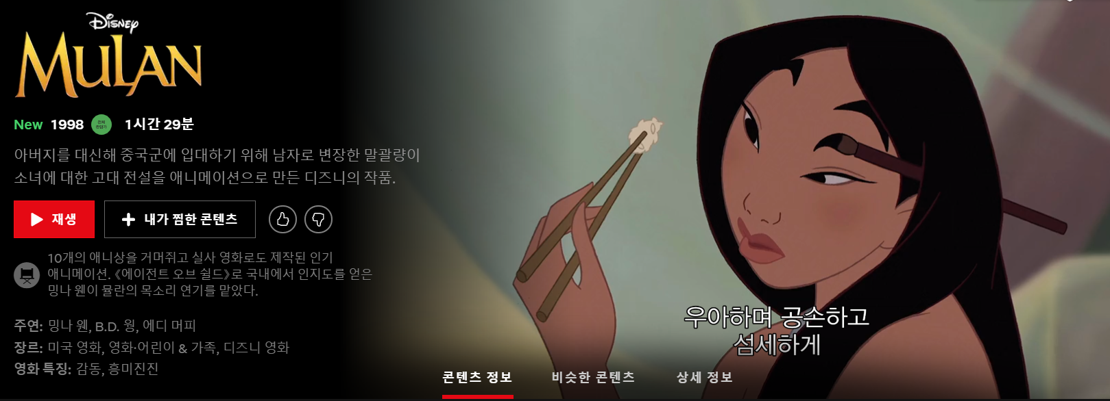 올 해 개봉을 앞두고 있는 뮬란 실사화 영화의 원작입니다. 뮬란은 동양을 배경으로 하는 몇 안되는 디즈니 애니메이션인데요. 어린시절 재밌어서 몇번이나 돌려봤던 기억이 있습니다. 아버지 대신 남장을 하고 전쟁을 나가게 되고, 나라를 구하고, 멋진 남자와 사랑에 빠지는 이야기 입니다. 요즘은 여성이 강한 케릭터가 흔한데, 옛날 애니메이션치고도 상당히 강한 여성을 부각시키는 애니메이션이었네요.