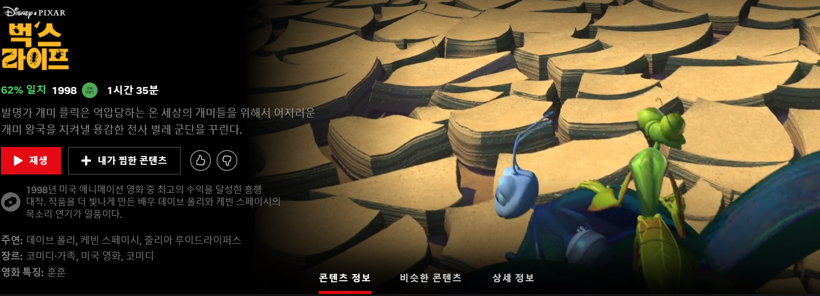 벌레들의 입장에서 바라본 세상을 그린 벅스라이프 입니다. 디즈니와 픽사가 함께 제작한 영화이구요. 미국 애니메이션 영화중 당시에는 최고의 수익을 냈던 신선한 영화라고 합니다. 저도 어릴때 보고 엄청 새로웠던 기억이 있네요. 곤충들의 입장에서 세상을 바라본다면? 하고 상상력도 풍부해지는 것 같고요.